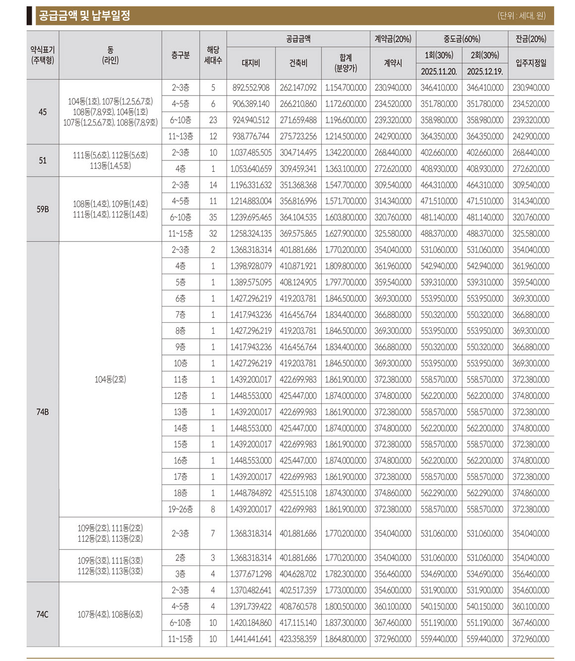 공급금액 및 납부일정